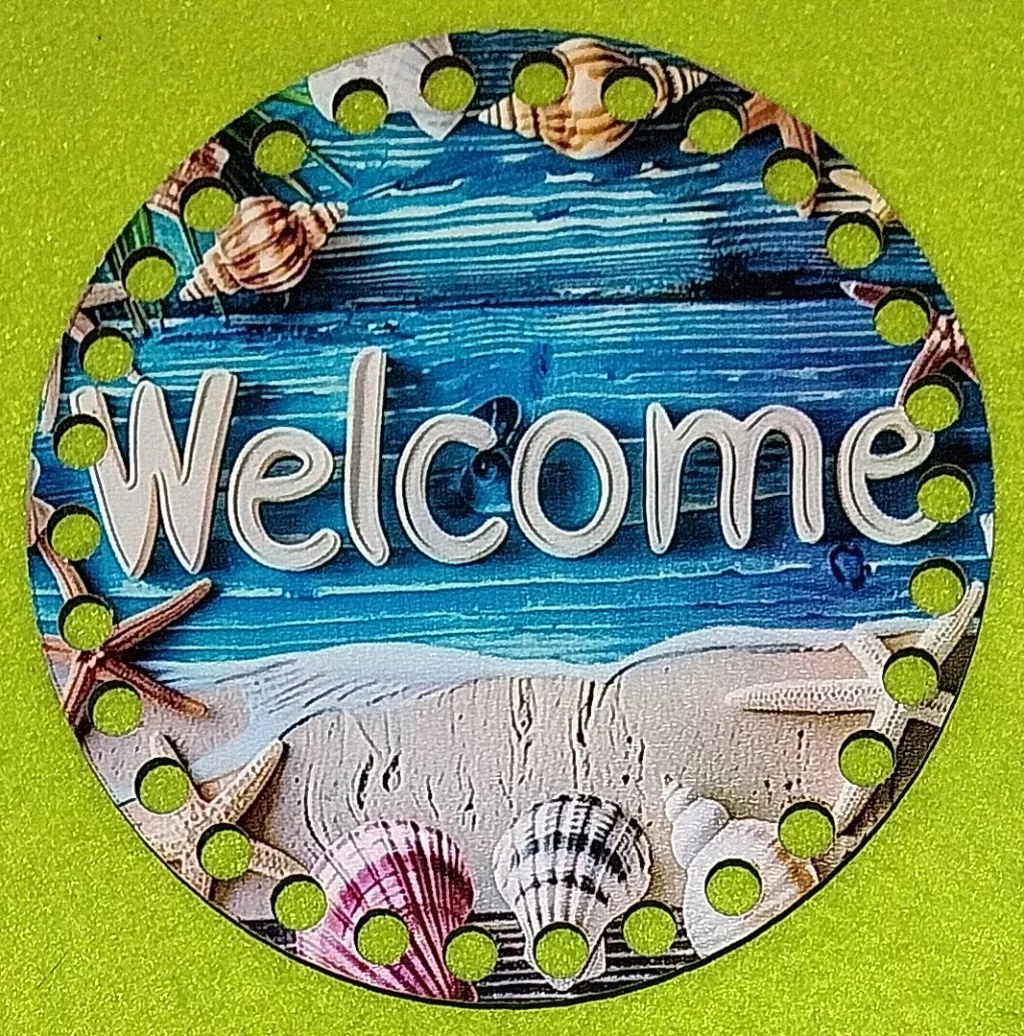 12cm Horgolható nyomtatott fa alap 7 mm lyukkal Kagylós tengerparti háttér welcome felirattal 1db/csomag 12cm vastagság 2,5mm