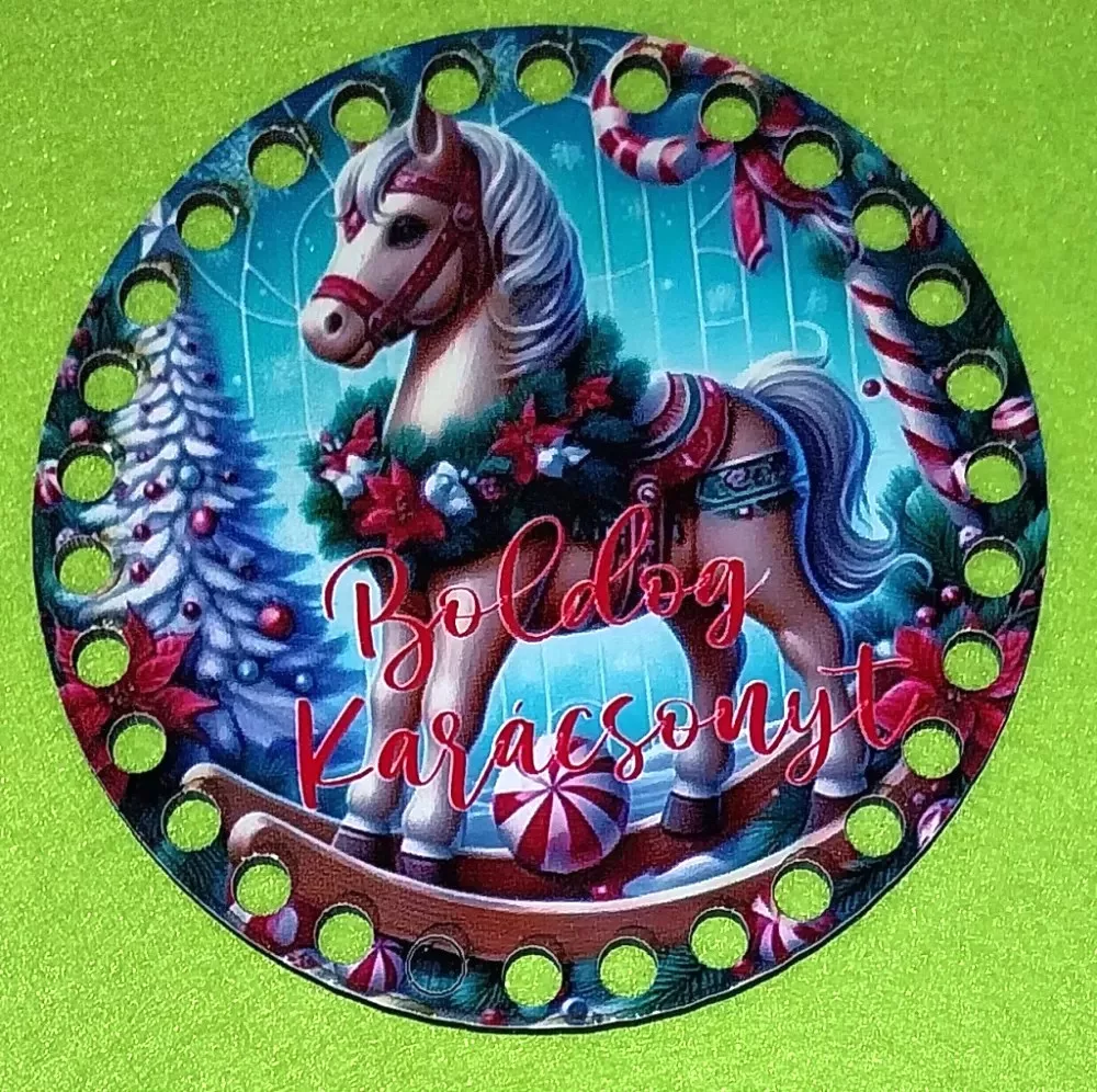 12cm kör Horgolható nyomtatott fa alap Hintaló Boldog karácsonyt felirattal . 7mm lyukkal 1db 12 cm vastagság 2,5mm