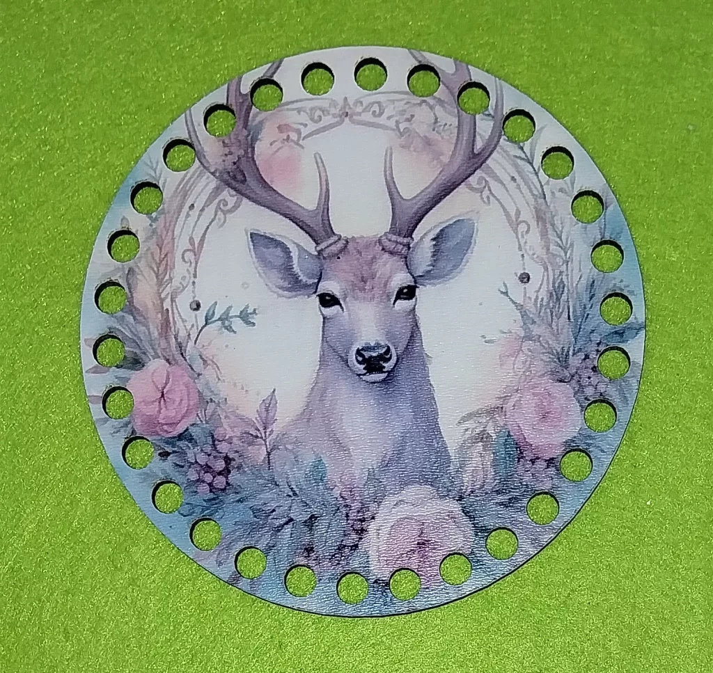 12cm kör Horgolható nyomtatott fa alap Szarvas virágok között 7mm lyukkal 1db 12 cm vastagság 2,5mm