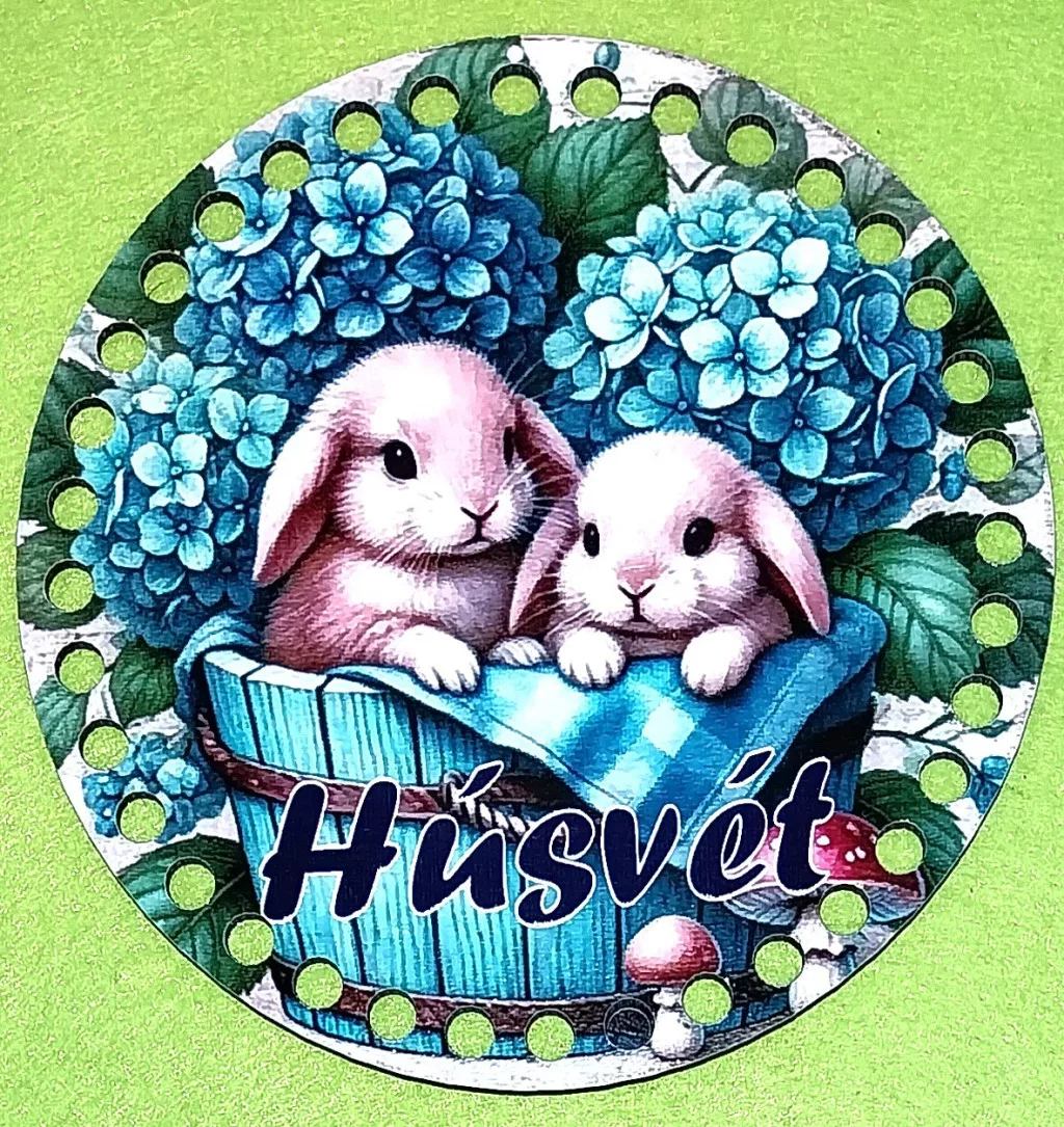 15cm Horgolható nyomtatott fa alap 7 mm lyukkal Két nyuszkó dézsában Húsvét felirattal 1db/csomag 15cm vastagság 3mm