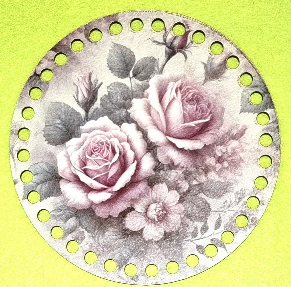 15cm Horgolható nyomtatott fa alap 7 mm lyukkal Rusztikus háttér rózsaszín rózsával 1db 15cm vastagság 2,5mm