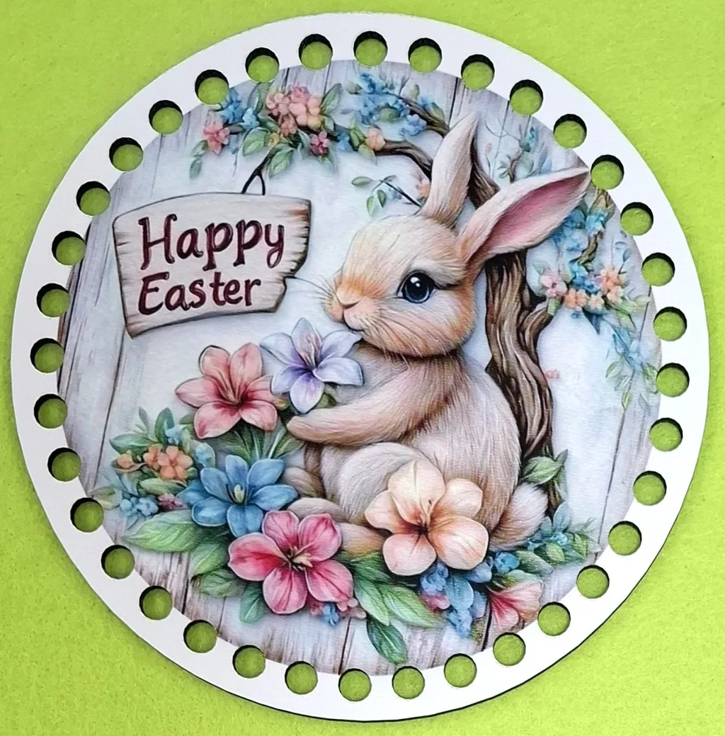 15cm Horgolható nyomtatott fa alap 7mm lyukka Nyuszkó színes virágokkal 1db 15cm vastagság 2,5mm
