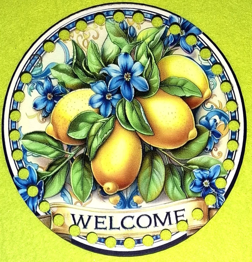 15cm Horgolható nyomtatott fa alap Citrom fürt Welcome felirattal 7mm lyukkal 1db 15cm vastagság 2,5mm