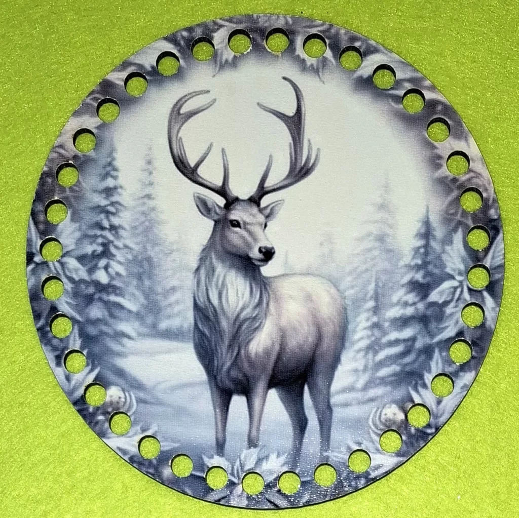 15cm Horgolható nyomtatott fa alap Fehér szarvas havas tájon 7mm lyukkal 1db 15cm vastagság 2,5mm