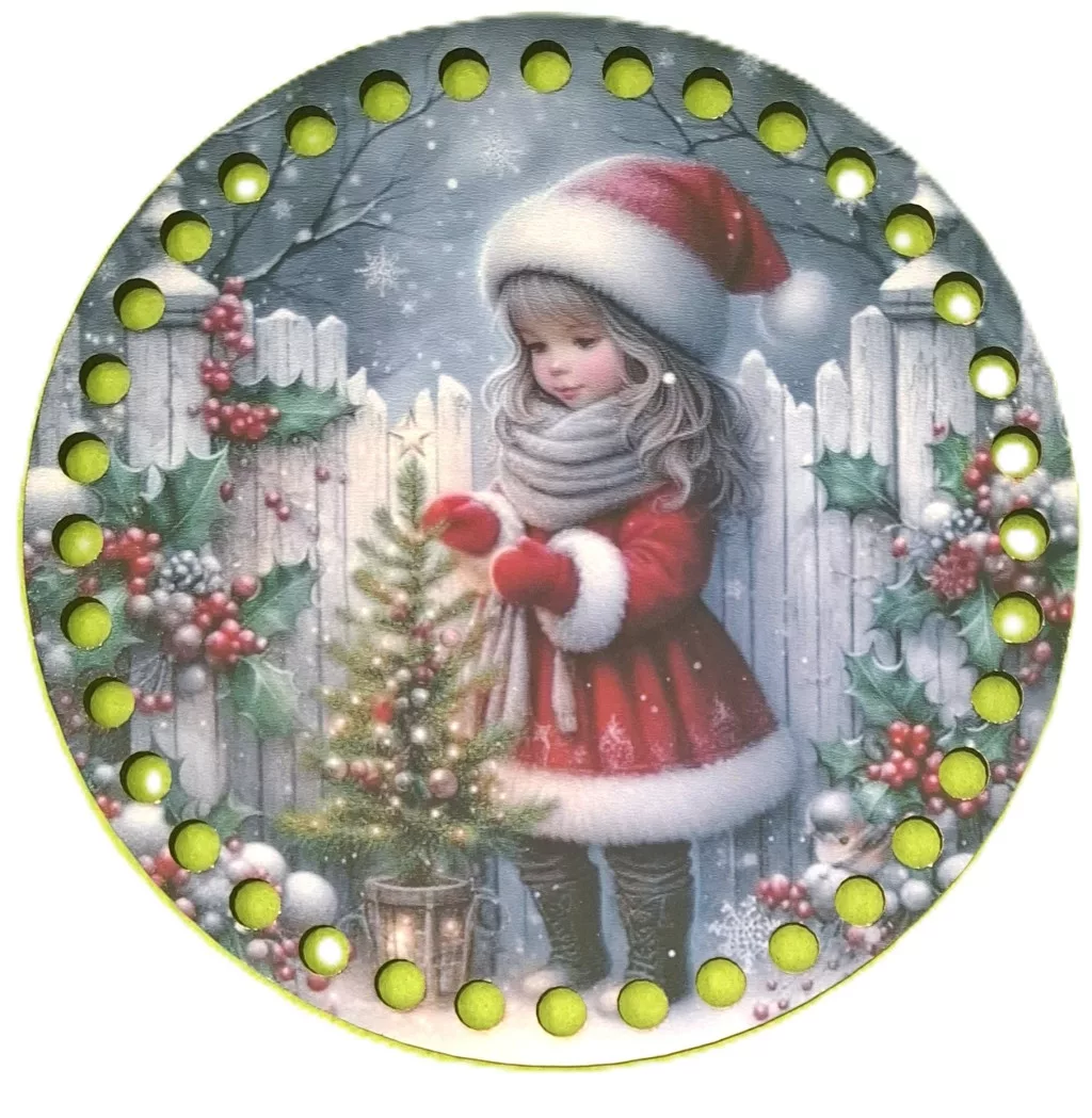 15cm Horgolható nyomtatott fa alap Kislány fenyőfával 7mm lyukkal 1db 15cm vastagság 2,5mm