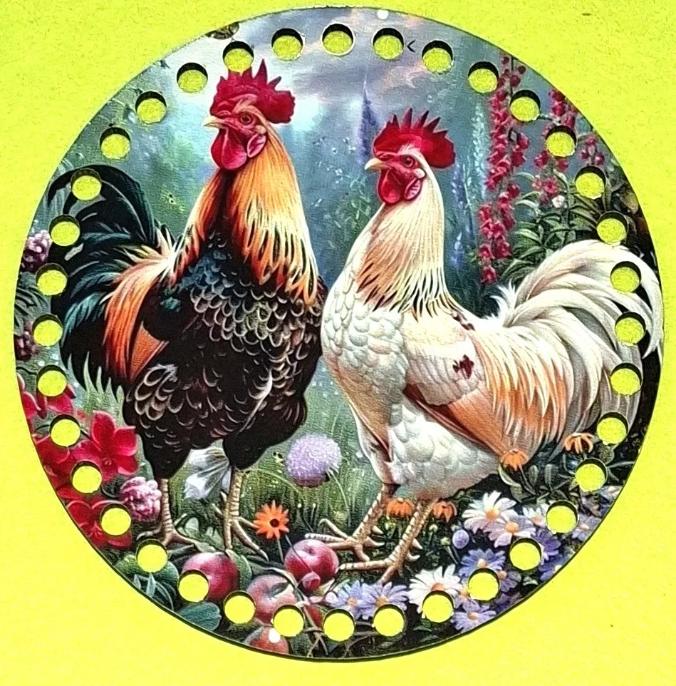 15cm Horgolható nyomtatott fa alap Tarka és fehér kakas 7mm lyukkal 1db 15cm vastagság 2,5mm