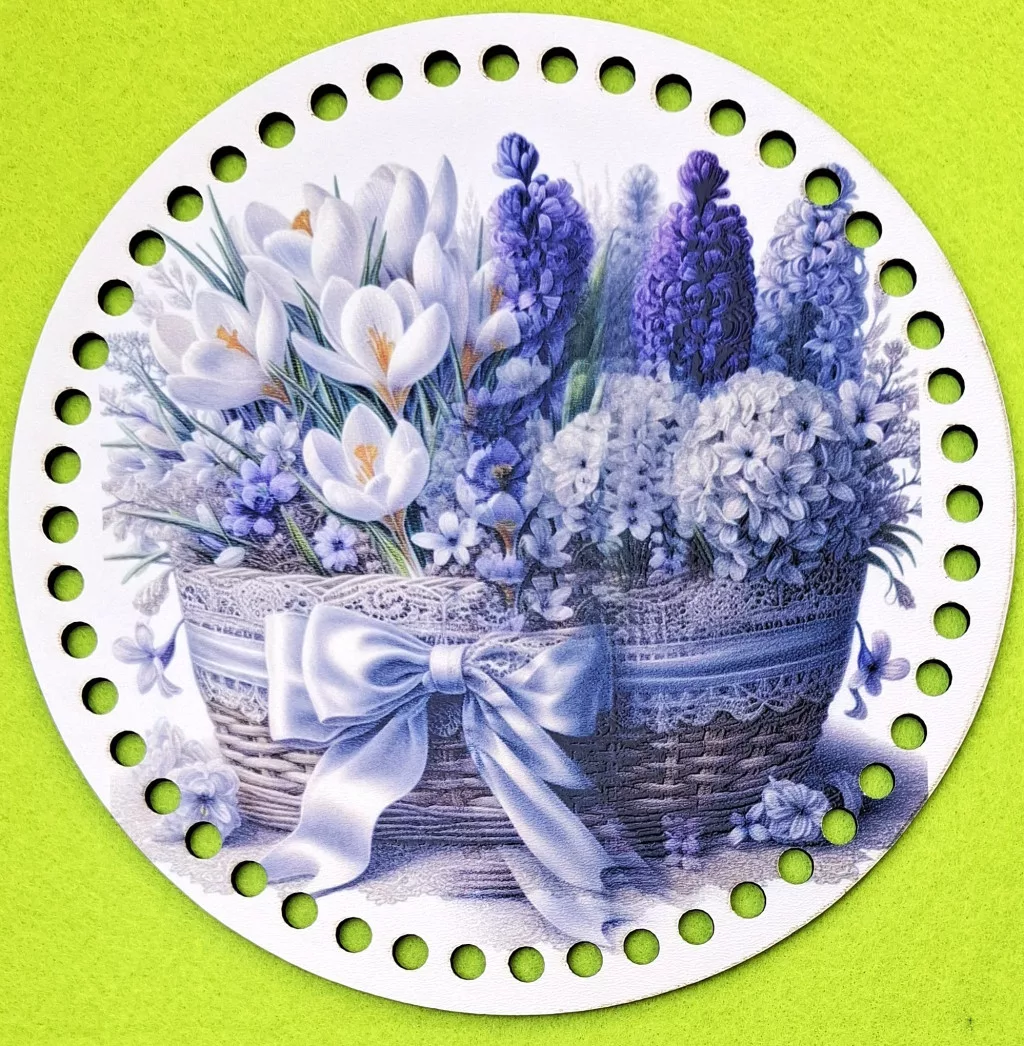 19,5cm Horgolható nyomtatott fa alap 7 mm lyukkal Hóvirág és lila jácint kosárban 1db 19,5cm vastagság 2,5mm