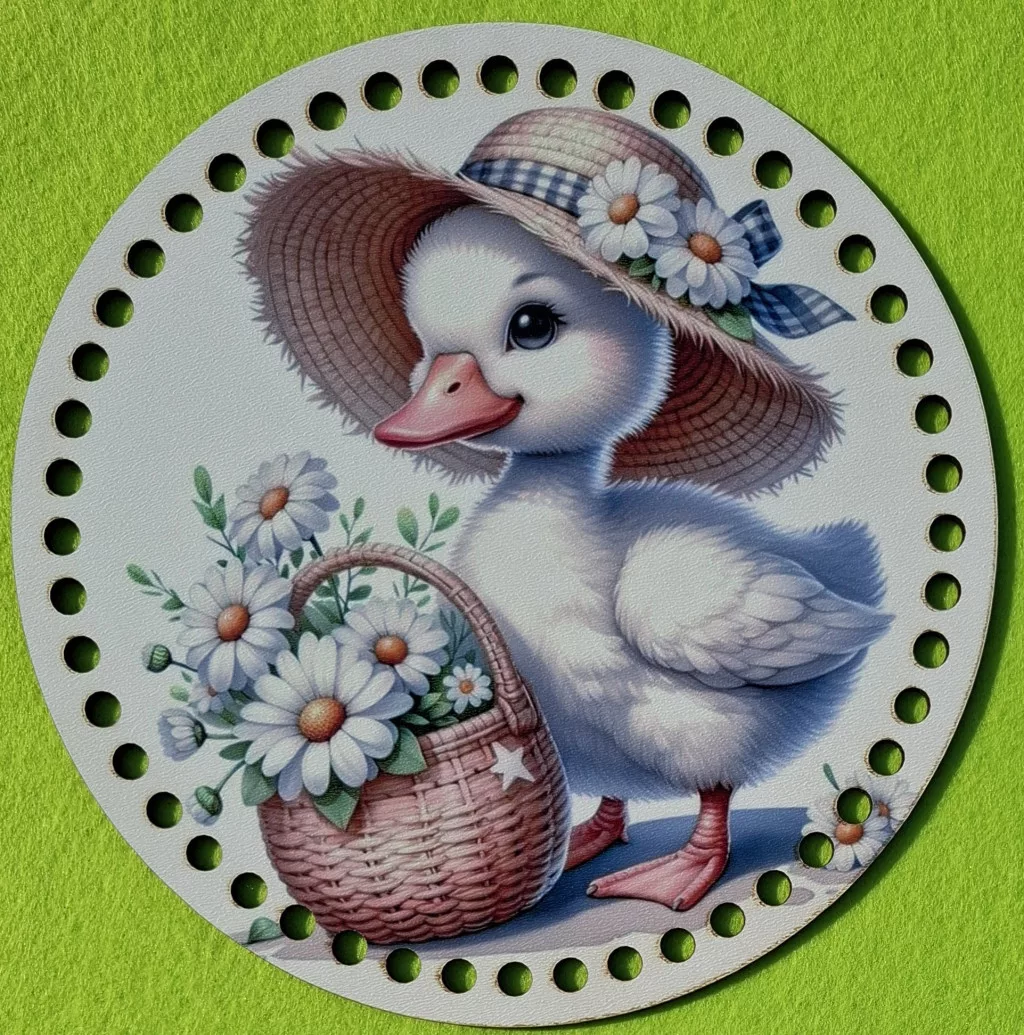 19,5cm Horgolható nyomtatott fa alap 7 mm lyukkal Kiskacsa Virág kosárral 1db 19,5cm vastagság 2,5mm