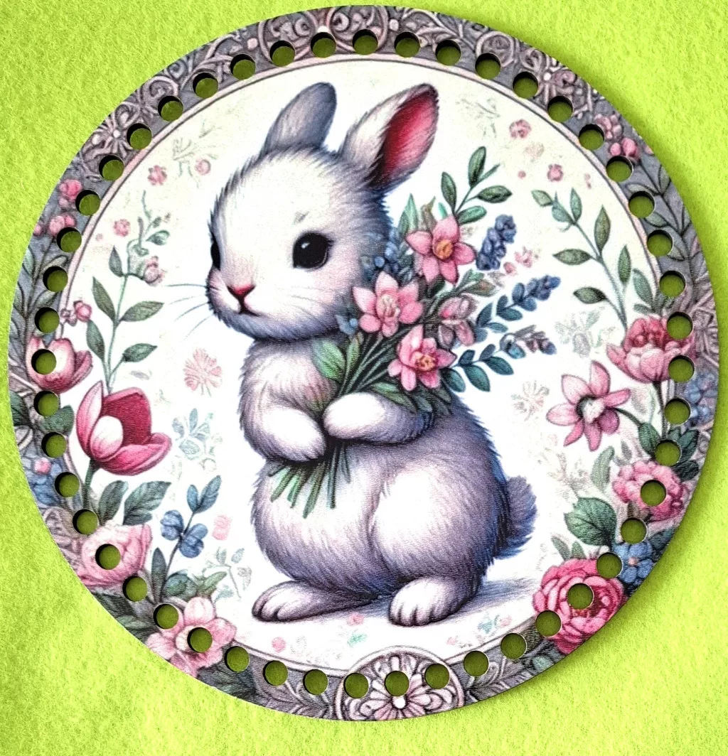 19,5cm Horgolható nyomtatott fa alap Fehér nyuszi virágcsokorral 1db 19,5cm vastagság 3mm