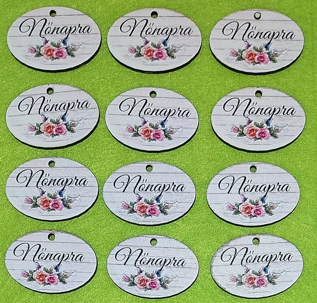 3x4,5 cm Ovális , nyomtatott fa tábla Deszka háttérrel rózsával Nőnapra felirattal 12db/csomag 3x4,5cm