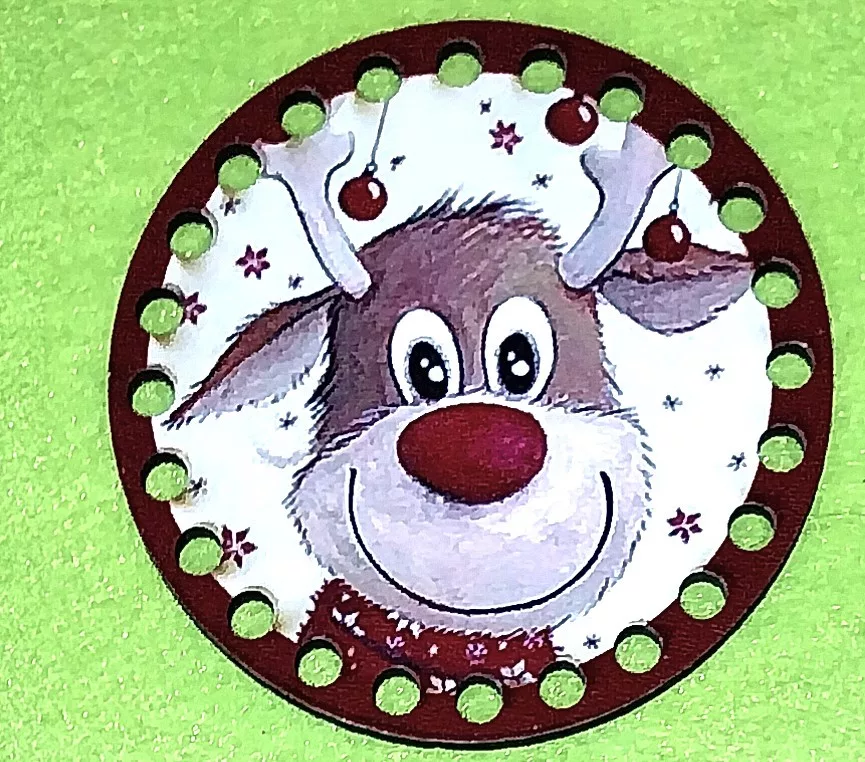 8cm kör Horgolható nyomtatott fa alap Rudolf piros kerettel 5mm lyukkal 1db 8cm vastagság 2,5mm