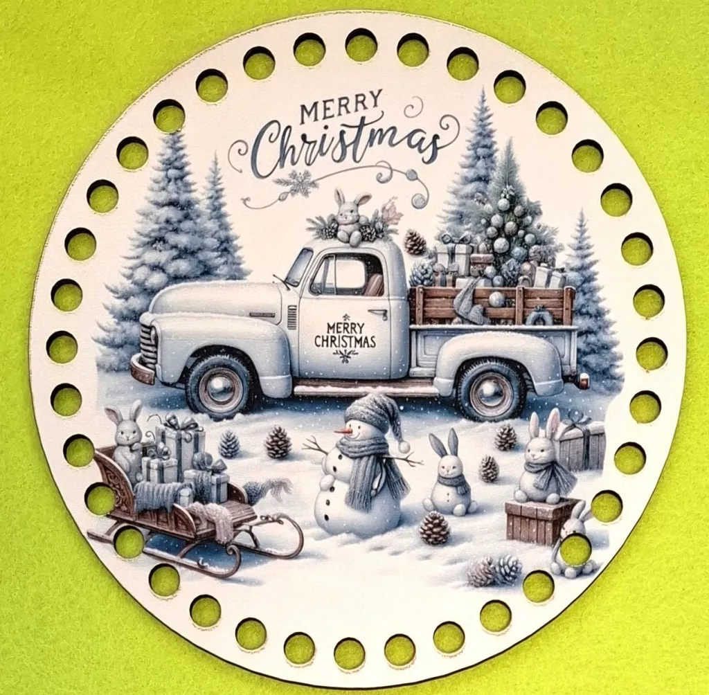 Horgolható nyomtatott fa Kopogtató közép Havas háttérrel nyuszi fekszik az autón Merry Christmas felirattal 1db 15cm vastagság 3mm