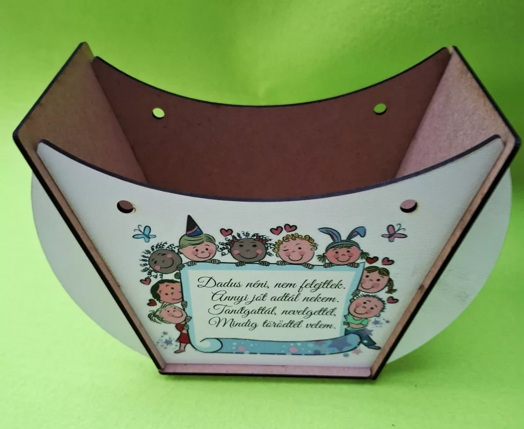 Lapraszerelt ridikül, Fehér alap Dadus néni, nem felejtlek….. 1szett széleség 19 cm magasság 14cm mélység 7,5cm anyag vastagság 2,5mm