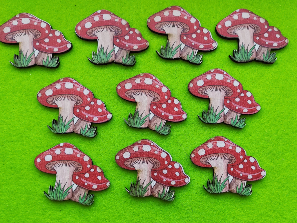 NYOM376 Nyomtatott Fa 3db piros gomba fűvel 10db/csomag 4 x 4 cm vastagság 3mm