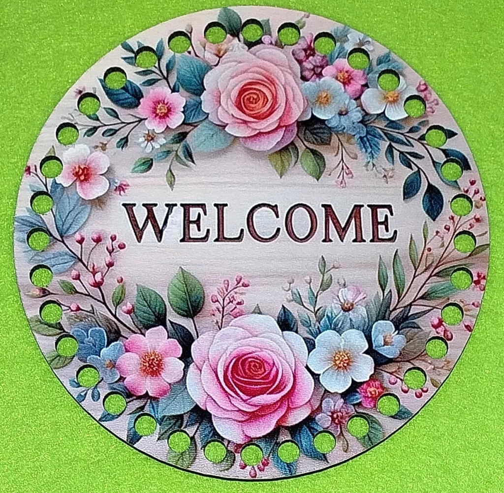 15cm Horgolható nyomtatott fa alap 7 mm lyukkal Rózsaszín rózsás háttér Welcome felirattal 1db/csomag 15cm vastagság 2,5mm