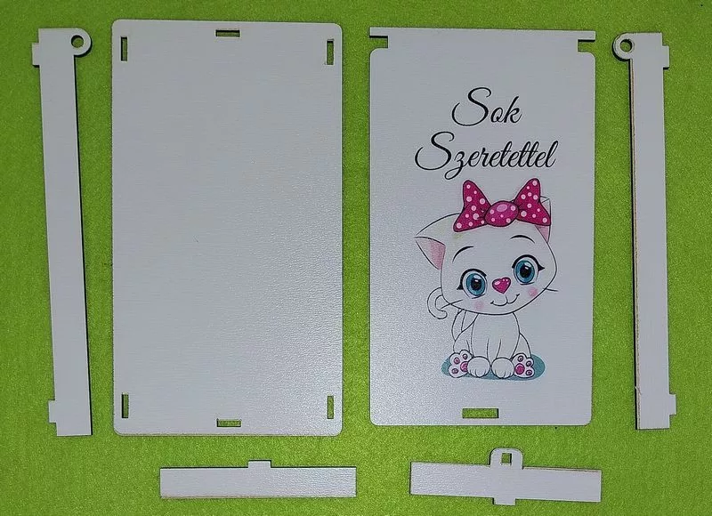 Nyomtatott fa Ballagási pénzátadó doboz Cicás Sok szeretettel felirattal 1 szett 10x18cm magasság 1,5cm vastagság 3mm