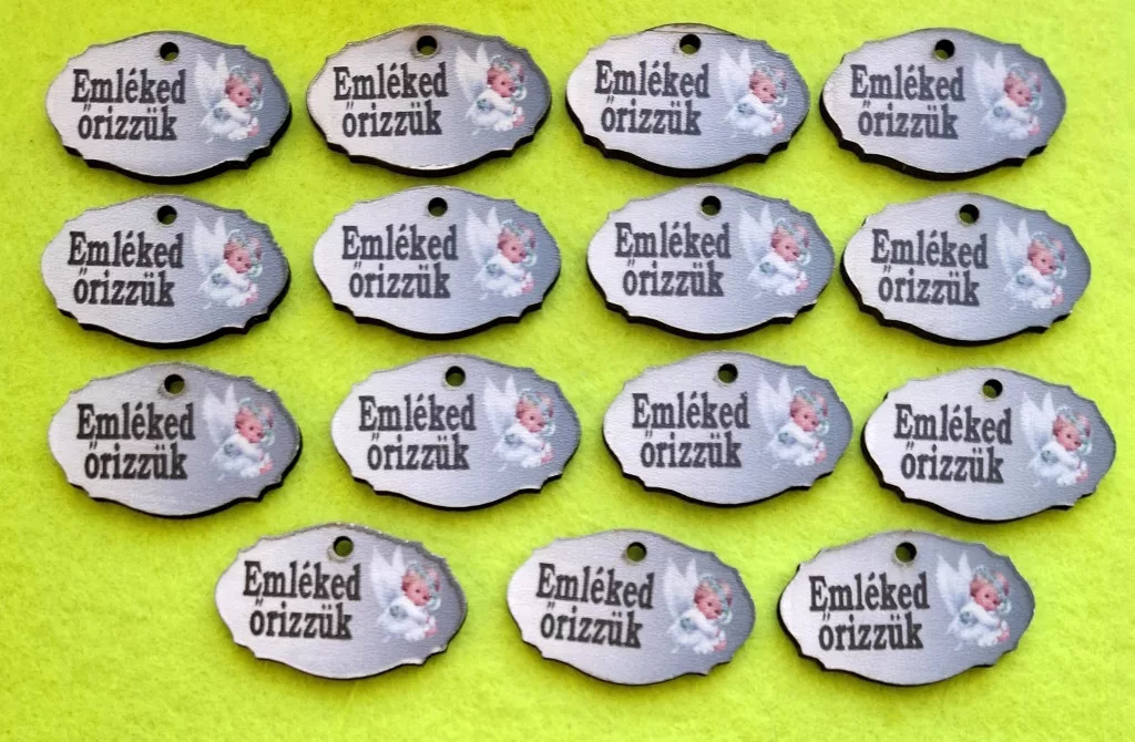 Nyomtatott fa Kicsi ovális tábla fehér szürke háttérrel angyalkával Emléked Őrizzük felirattal 4x2,5cm vastagság 3mm