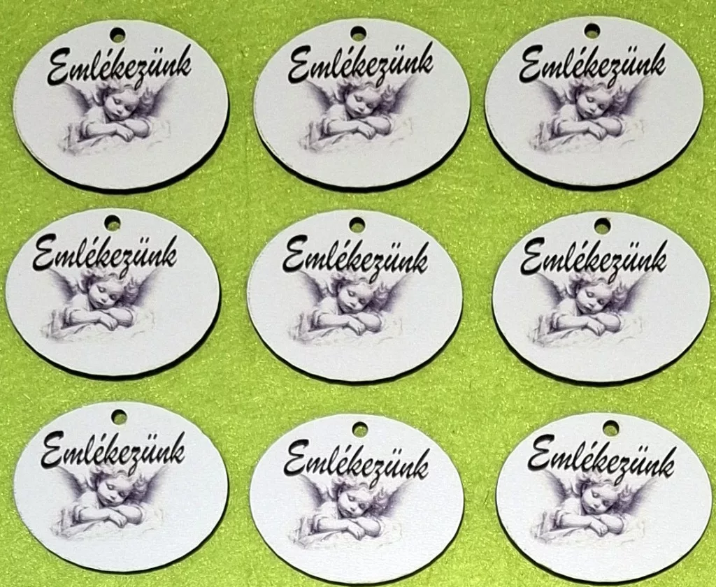 Nyomtatott fa Ovális tábla angyalkával Emlékezünk felirattal 9db/csomag 4,5x3,5cm magasság