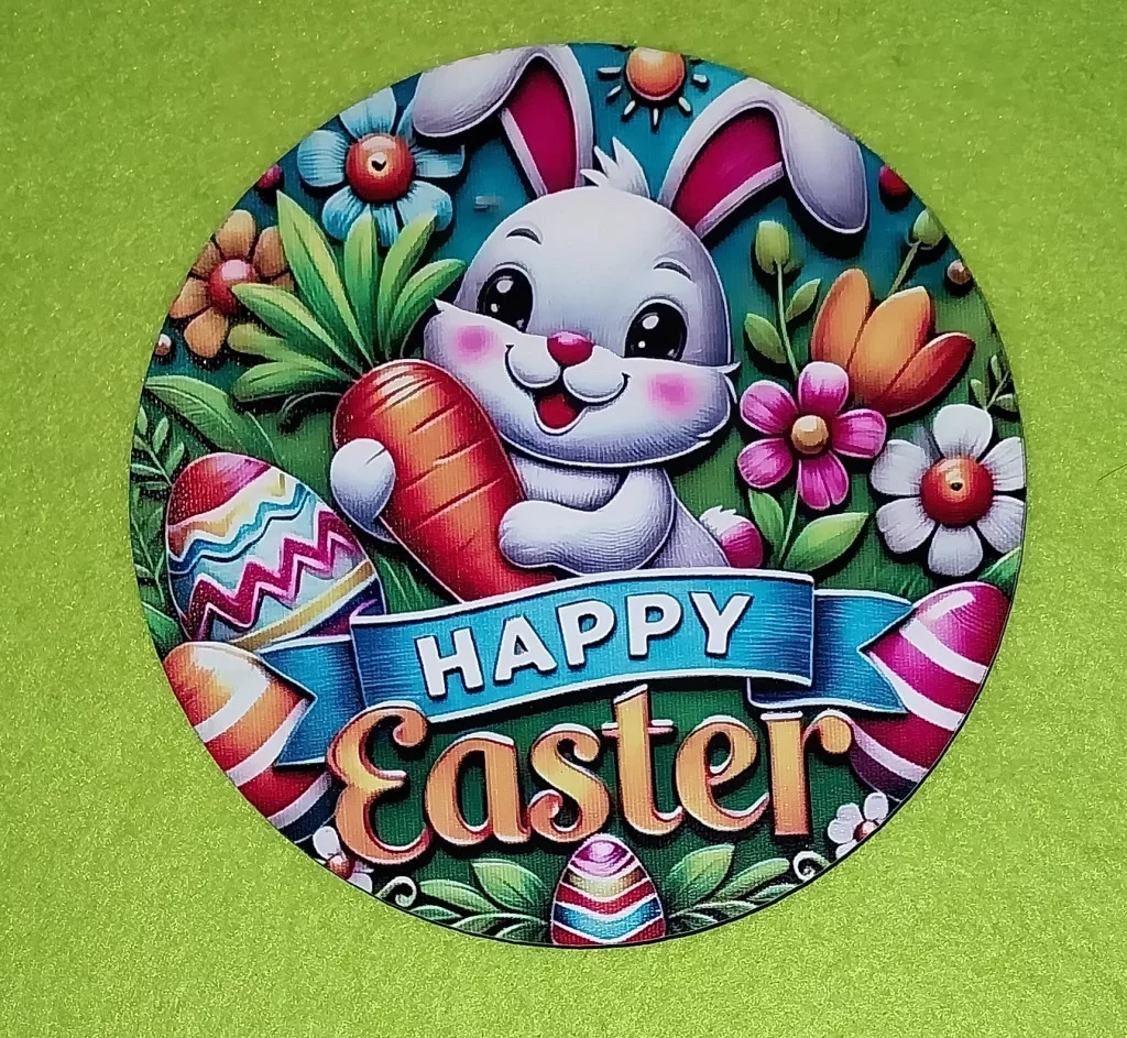 Nyomtatott fa kopogtató közép Fehér nyuszi virágok között répával a kézben Happy Easter felirattal 1db 15cm vastagság 3mm