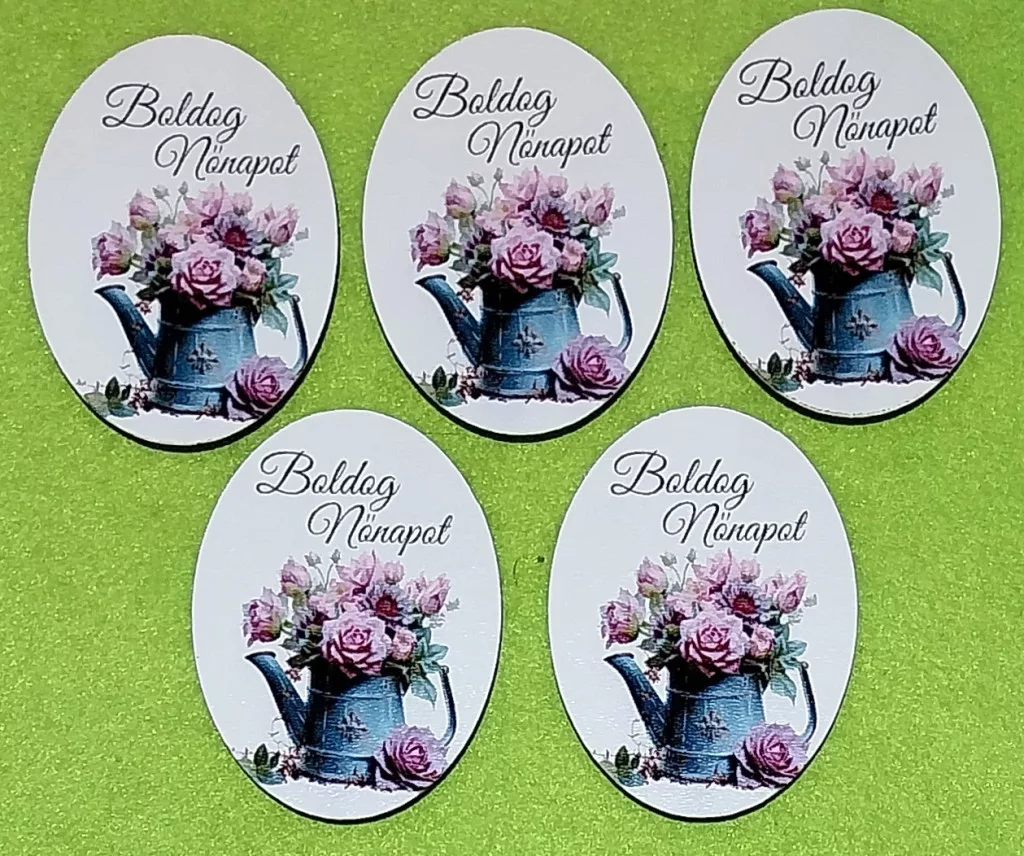 Nyomtatott fa ovális tábla Locsoló kana rózsaszín rózsa Nőnapra felirattal 5db/csomag 5x6,5cm vastagság 2,5mm