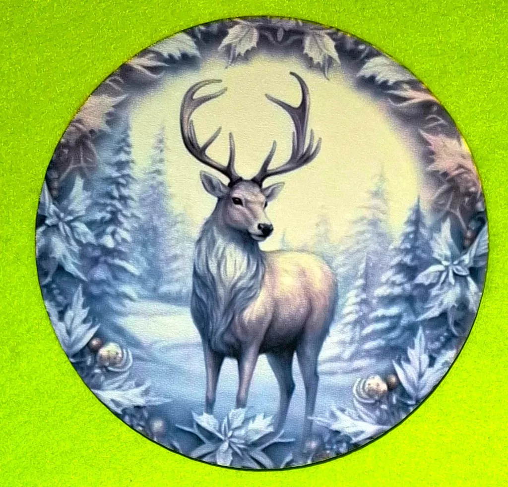 Nyomtatott kerek kopogtató közép Fehér szarvas havas tájon 1db 15cm vastagság 2,5mm