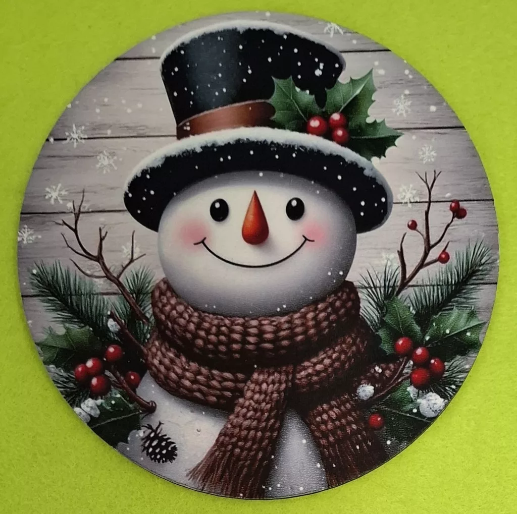 Nyomtatott kerek kopogtató közép Hóember deszkás háttér 1db 15cm vastagság 2,5mm
