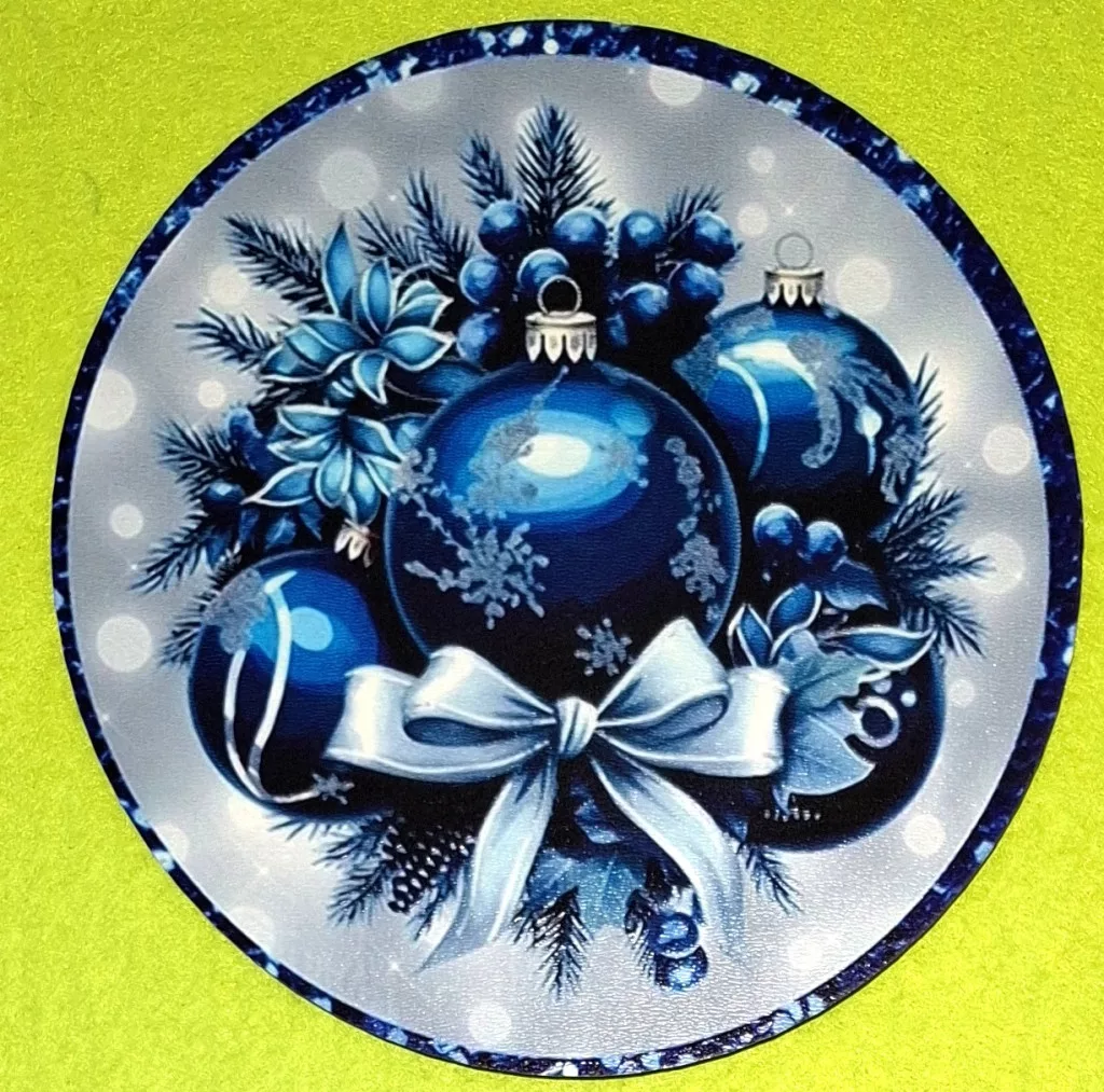 Nyomtatott kerek kopogtató közép Kék karácsonyfa gömb szalaggal. 1db 15cm vastagság 2,5mm