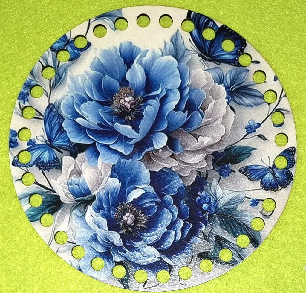 15cm Horgolható nyomtatott fa alap 7 mm lyukkal Kék pillangós és virágos 1db 15cm vastagság 2,5mm