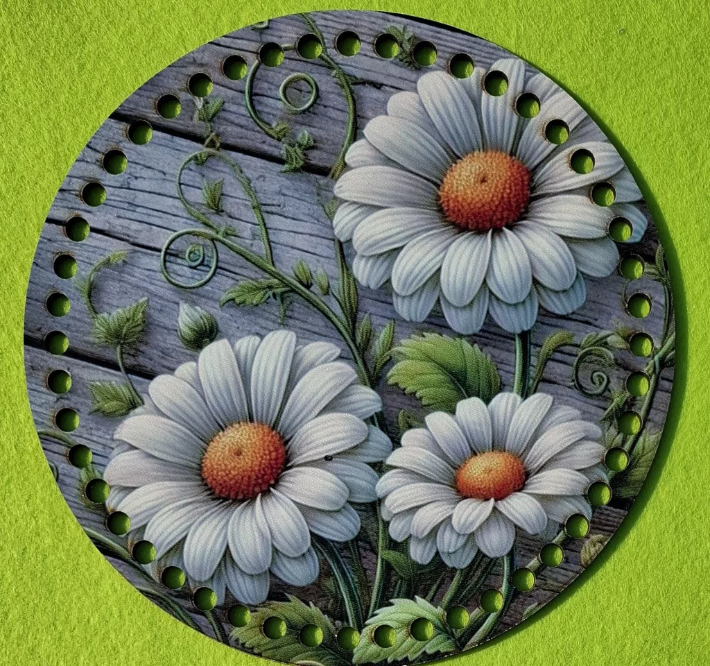 19,5cm Horgolható nyomtatott fa alap 7 mm lyukkal Deszkás háttér, margarétás 1db 19,5cm vastagság 2,5mm