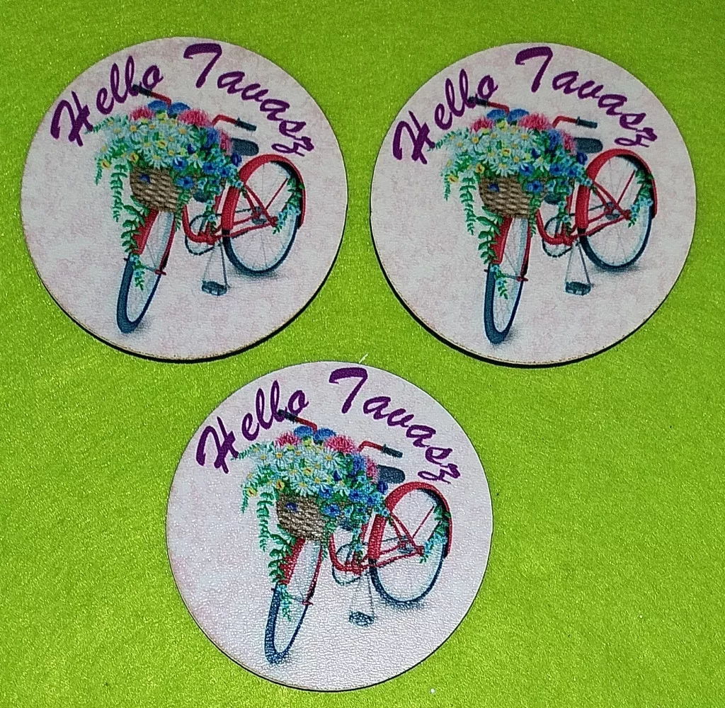 8cm Kerek Nyomtatott fa Hello Tavasz tábla Kerékpárral 3db/csomag