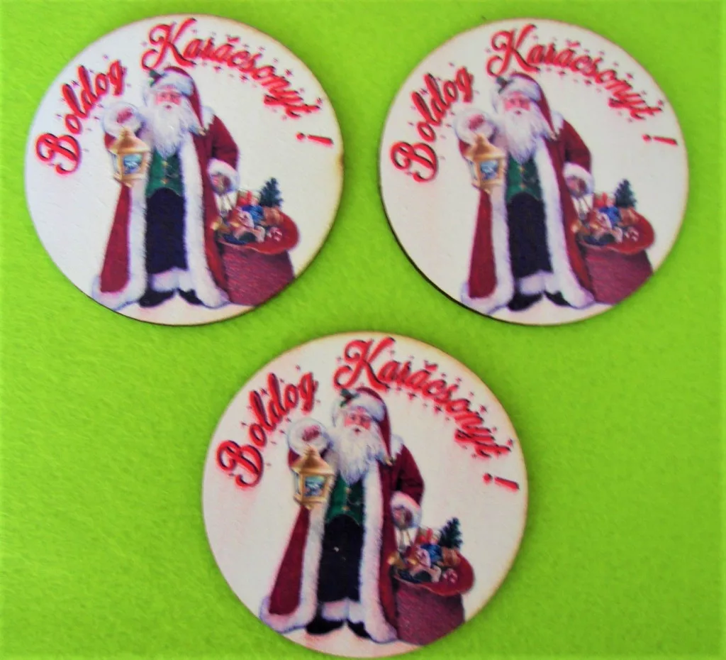 8cm Kerek Nyomtatott fa Boldog karácsonyt tábla télapóval fehér háttérrel 3db/csomag