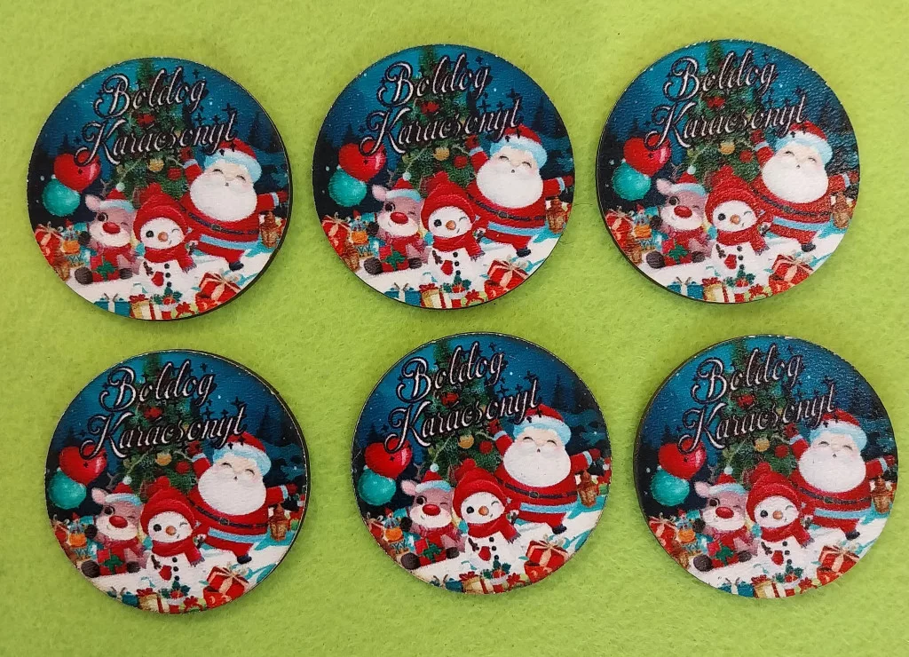 Nyomtatott Fa Rénszarvas, télapó ,hóember fenyőfával Boldog karácsonyt felirattal 6db/csomag 5cm