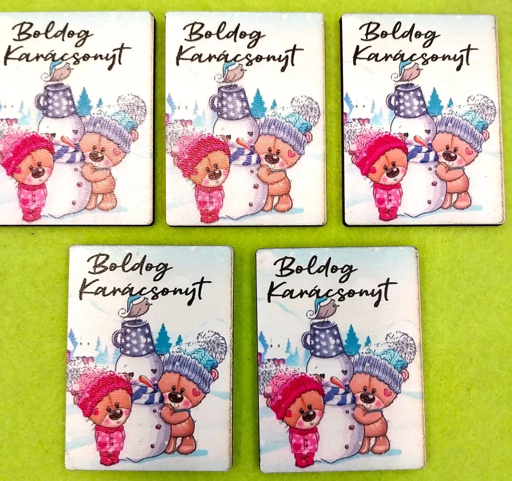Nyomtatott fa Hóember macikkal Boldog Karácsonyt felirattal 5db/csomag 6x4,5cm