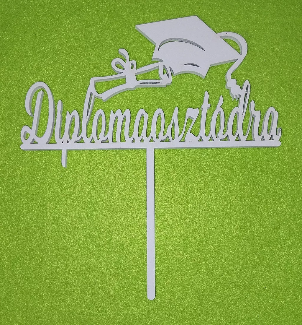 Fehér fa beszúrós dísz Ballagási sapkás, Diplomaosztódra felirattal 1db/csomag 13x14,5cm