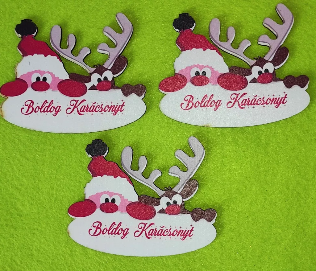 Nyomtatott fa Bolgog karcsonyt felirattal Rudolf és télapó 3db/ csomag 9x7cm