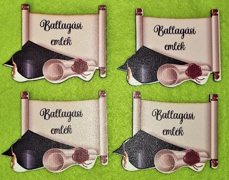 7,5x5,5 cm Nyomtatott fa tábla ,Ballagási emlék felirattal ,ballagási sapkával és pergamenttel 4db/csomag