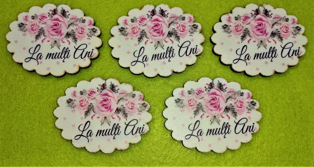 Nyomtatott Fa Ovális csipkés tábla Rózsaszín rózsával La Multi Ani felirattal 5db/csomag 6,5x5cm
