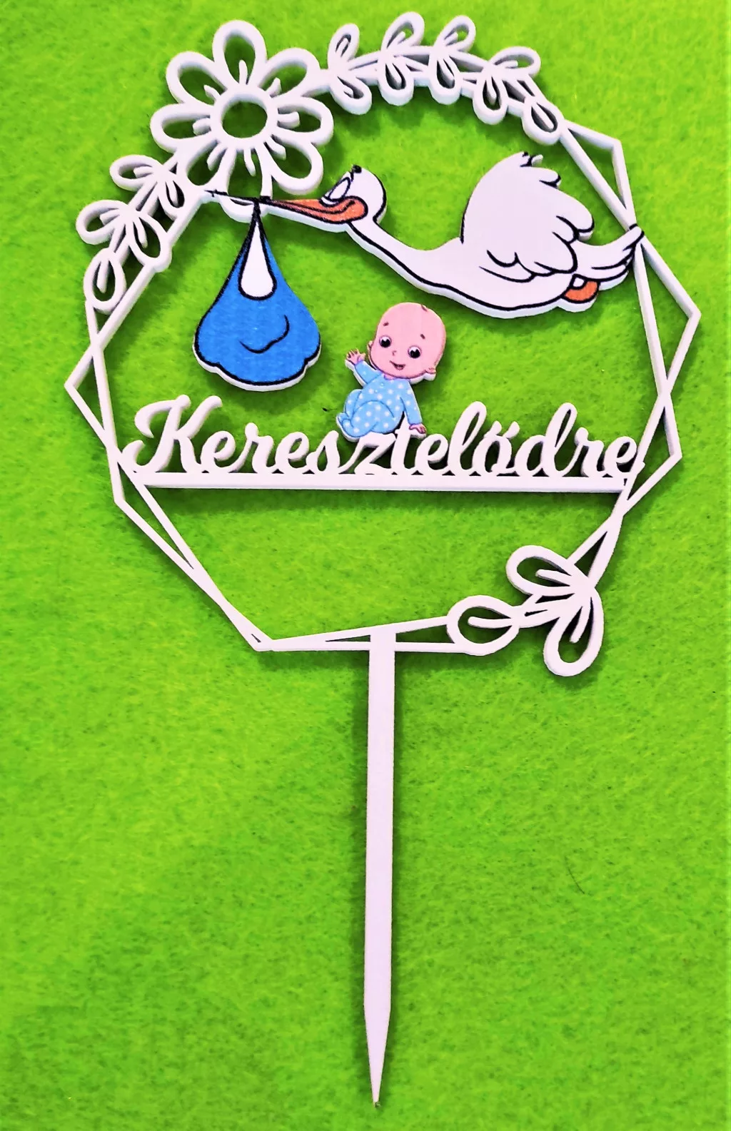 NYOM295 Nyomtatott fa Beszúrós Fiús beszúrós dísz Keresztelődre felirattal 1db 10x17cm vastagság 3mm