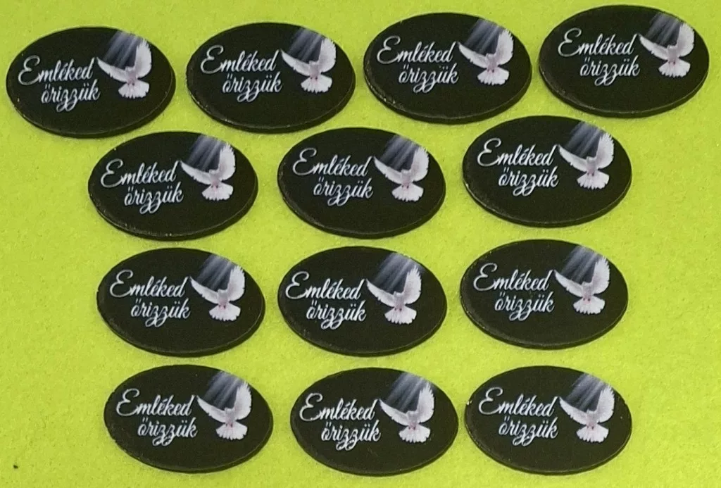 Nyomtatott fa fekete tábla galambbal Emléked őrizzük felirattal 13db/csomag 2,5x4cm