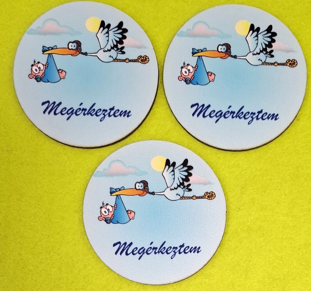 Nyomtatott fa kör tábla Gólya kék babával megérkeztem felirattal 3db/ csomag 7cm