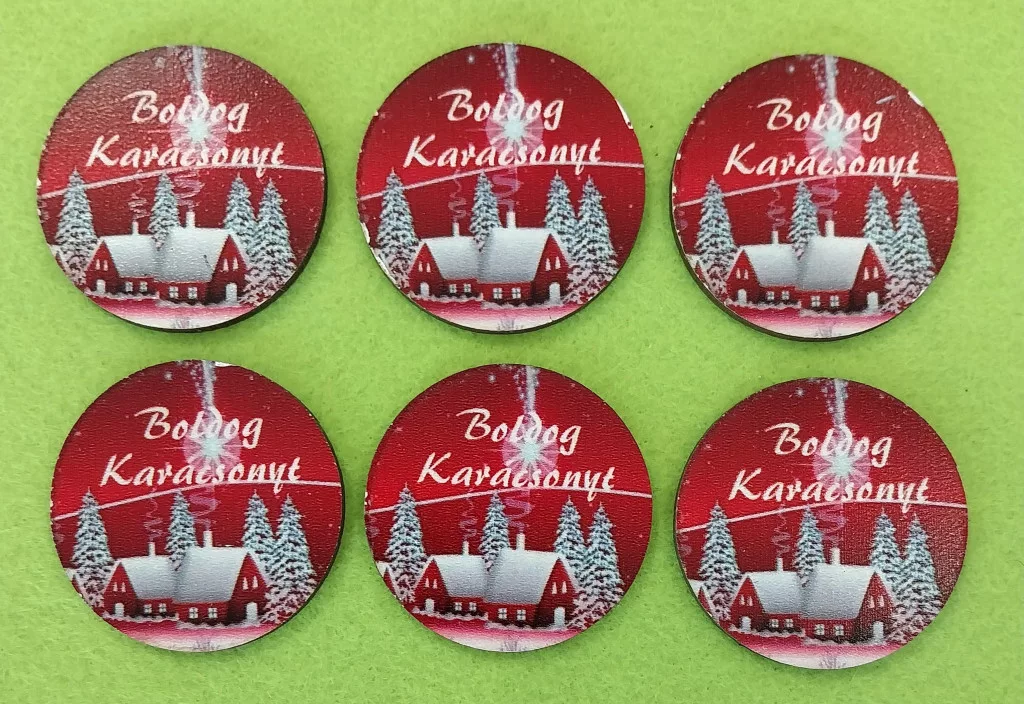 Nyomtatott Fa Közepes Piros háttérrel Boldog karácsonyt felirattal 6db/csomag 5cm