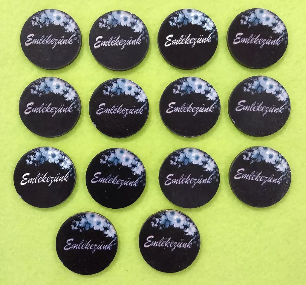 Nyomtatott Fa Fekete háttérrel fehér virággal Emlékezünk felirattal 14db/csomag 3cm vasta