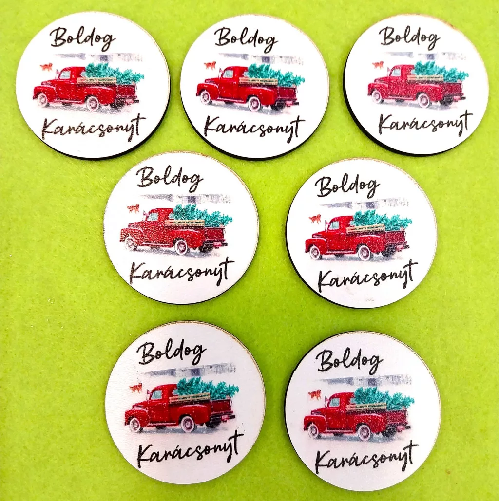 Nyomtatott fa Körlap piros autós Boldog Karácsonyt felirattal 7db/csomag 5cm