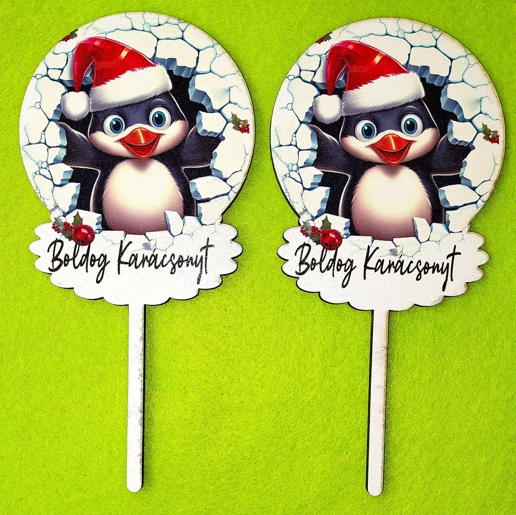 Nyomtatott fa beszúrós dísz Pingvin Boldog Karácsonyt felirattal 2db/csomag 8x15cm