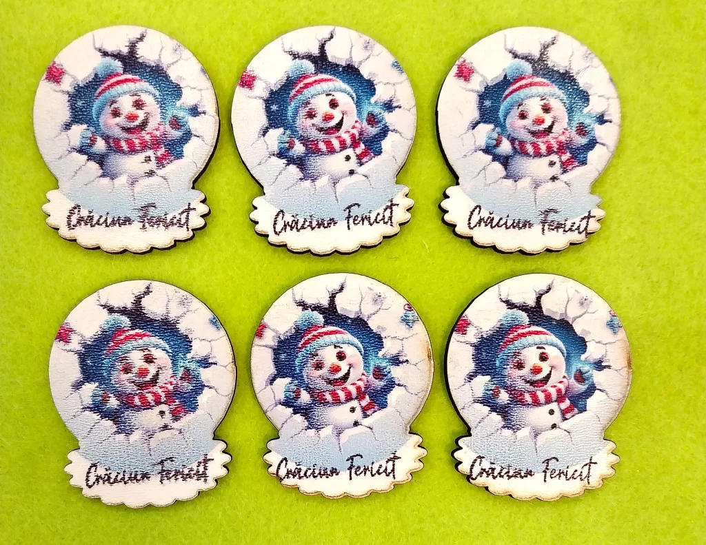 Nyomtatott fa Hóemberes Craciun Fericit felirattal 6db/csomag 4,5x5,5cm