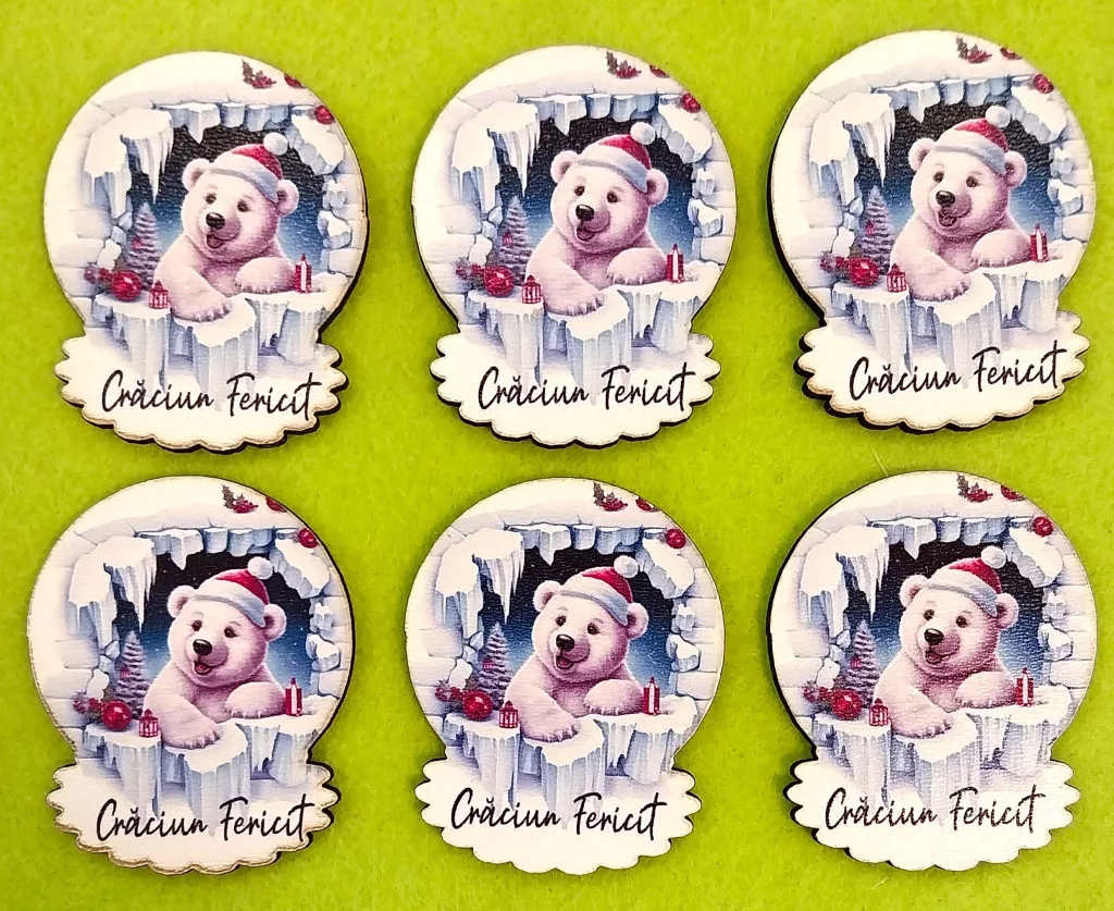 Nyomtatott fa Jeges macis Craciun Fericit felirattal 6db/csomag 4,5x5,5cm
