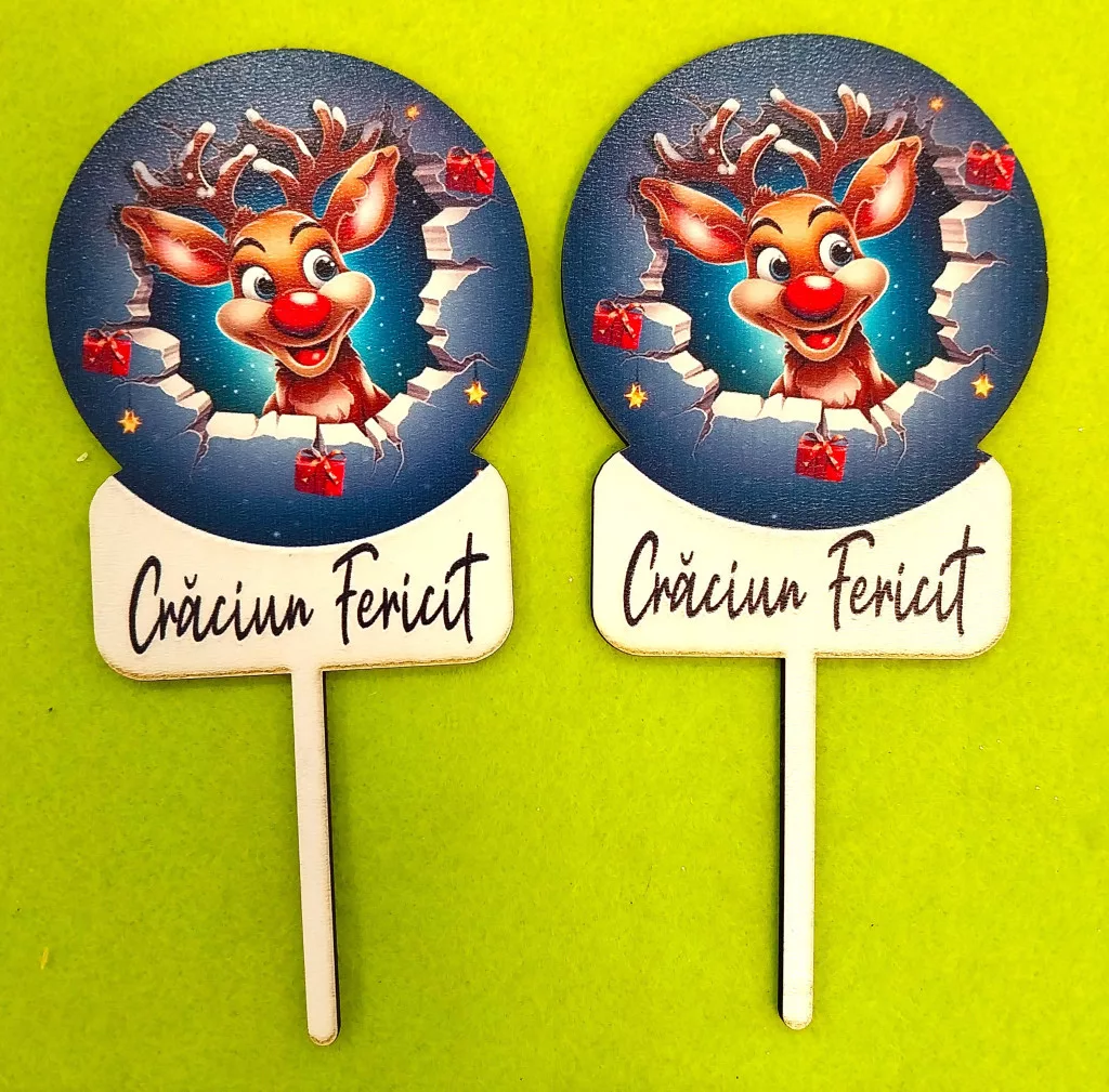 Nyomtatott fa beszúrós dísz Rudolf Craciun Fericit felirattal 2db/csomag 8x15cm