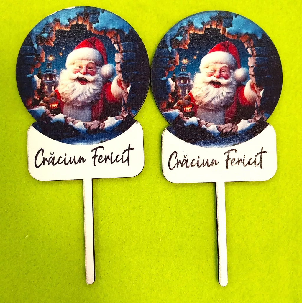 Nyomtatott fa beszúrós dísz Télapós Craciun Fericit felirattal 2db/csomag 8x15cm