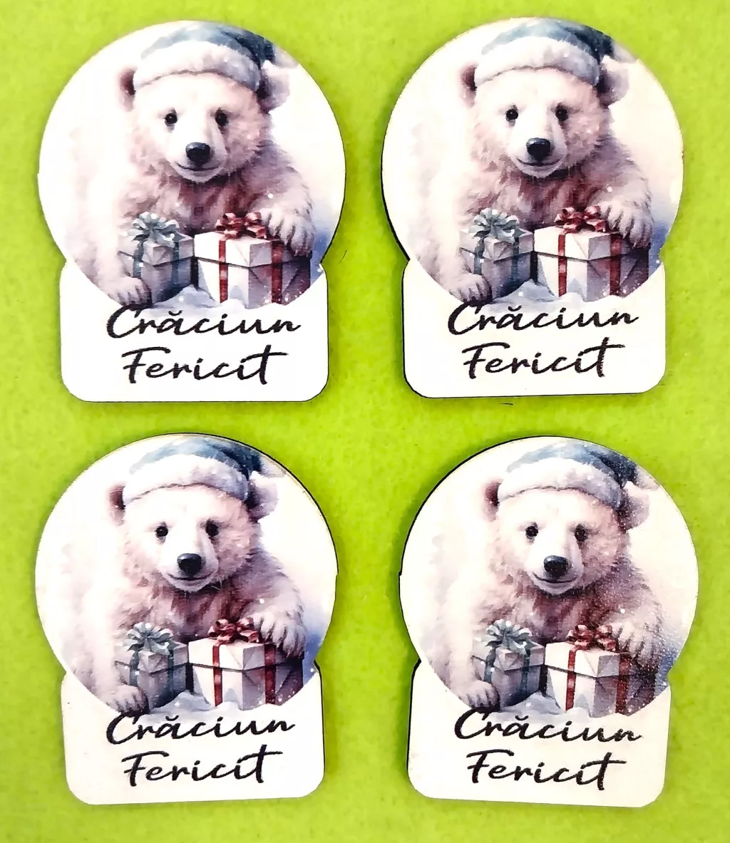 Nyomtatott fa Jeges macis Tábla Craciun Fericit felirattal 4db/csomag 5x6cm