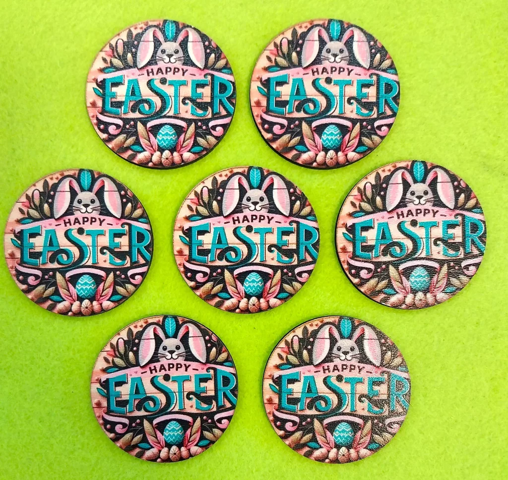 Nyomtatott Fa Kerek deszka hatású nyuszi tojásokkal Happy easter felirattal 7db/csomag 5cm